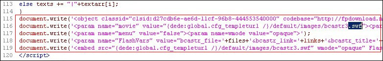 首先:在您的网站源码中找到使用bcastr3.swf的文件,一般来说在模板文件里。比如bcastr3.swf在您的模板首页里。您的模板文件是放在wwwroot/template/default/index.htm,请将index.htm文件下载到您本地,并先备份。