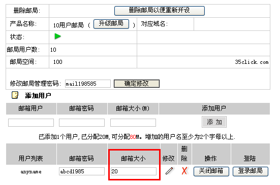 添加邮箱用户的时候,在"邮箱大小"中输入每个邮箱的大小即可,单位是M