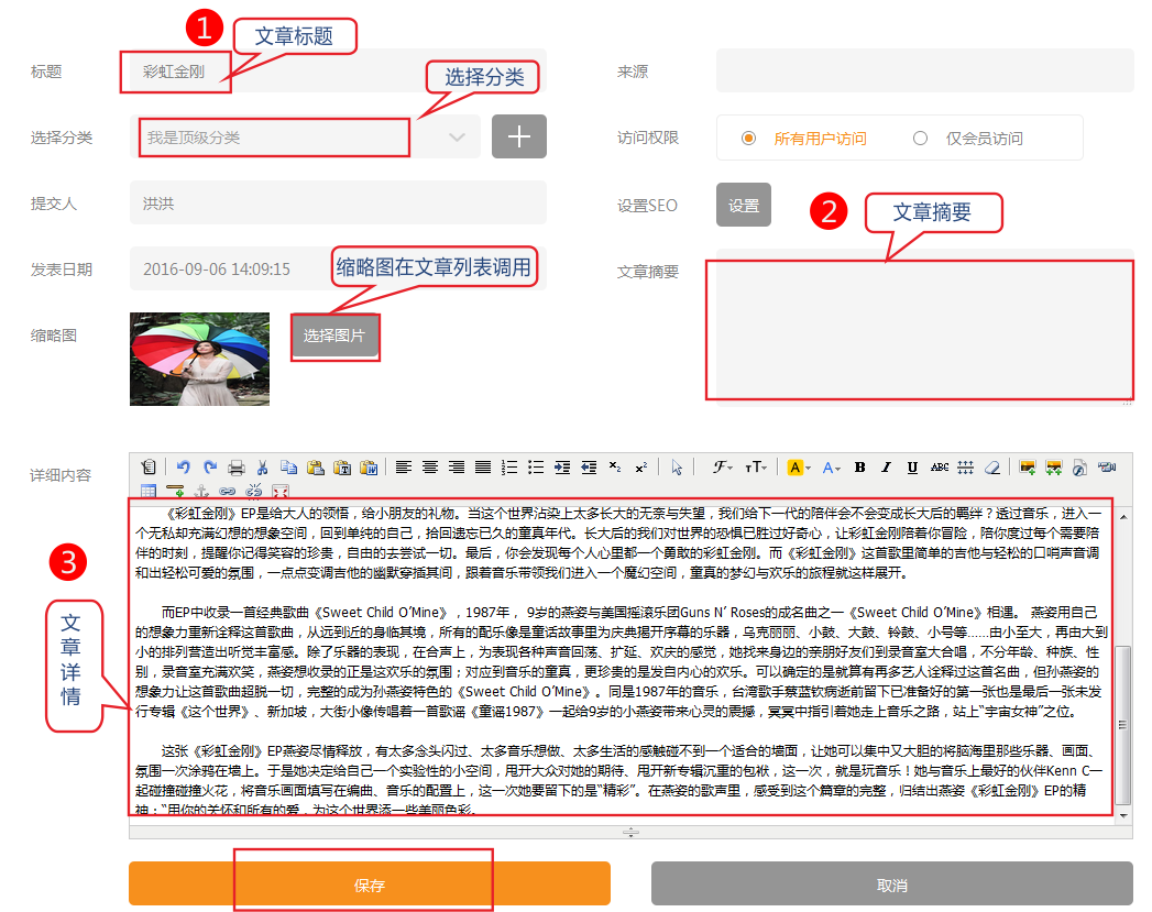 文章类别:一篇文章必须属于一个类别,这个便于管理所以可能添加分类往往是第一步的。文章名称:一篇文章当然也是必须有这篇文章的名称摘要::简要的描述您文章的内容详细介绍:详细介绍部分,您可以自由发挥
