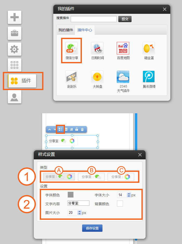 2 支持文字颜色,字体大小,文字内容 ,图片大小,背景颜色设定可通过调整字体大小和图片大小来设置插件的宽度和高度