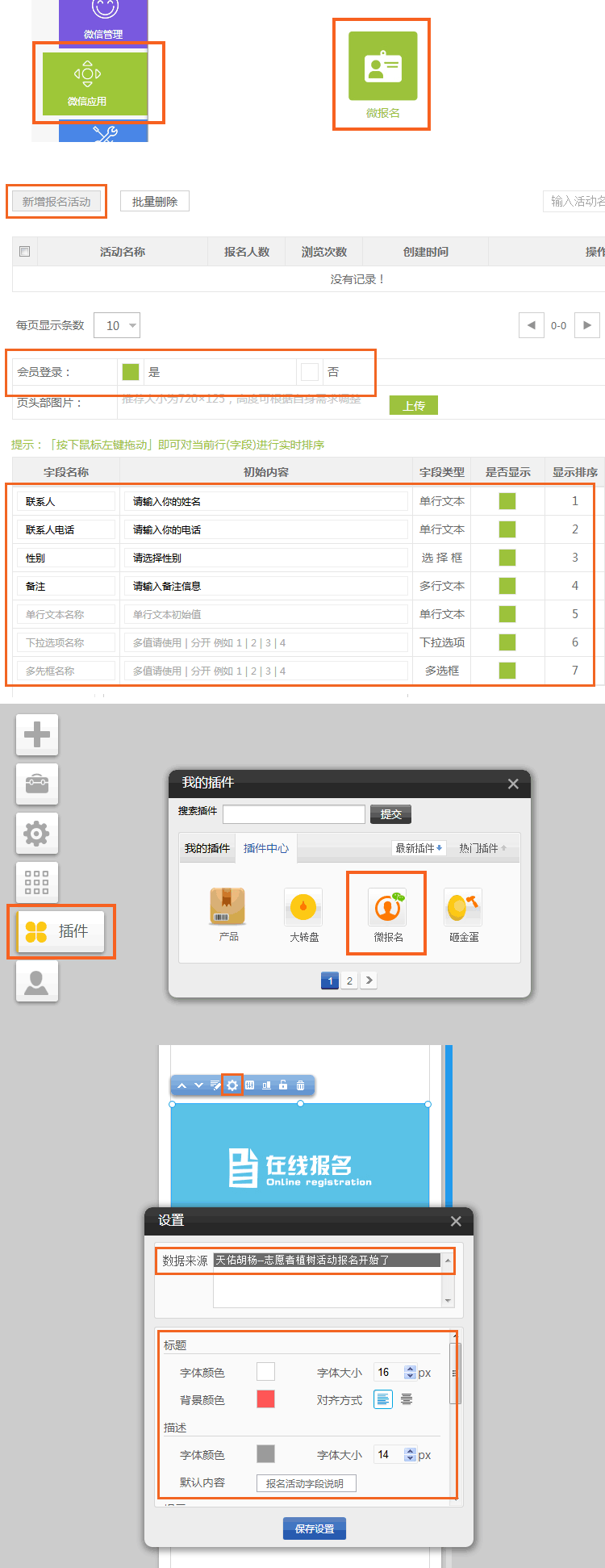 后台:可以添加多个报名活动,自定义报名表单内容,设定是否需要会员登录,查看报名参加人员前台:插件中心,新增微报名插件可选择使用哪个报名数据可设置报名界面样式