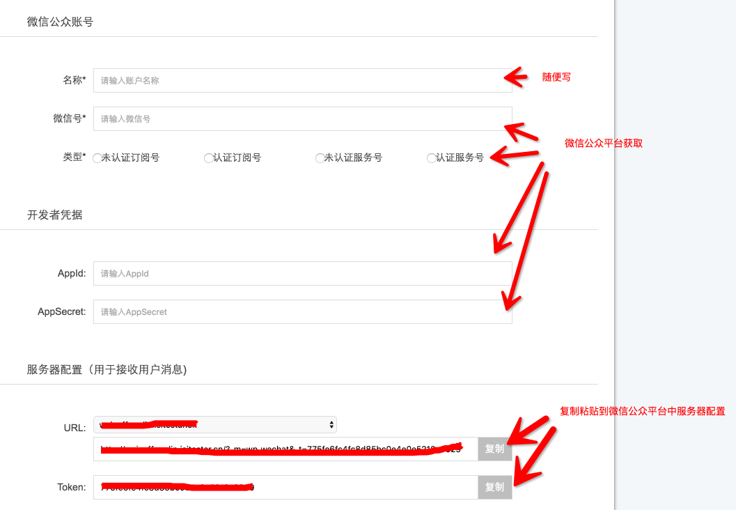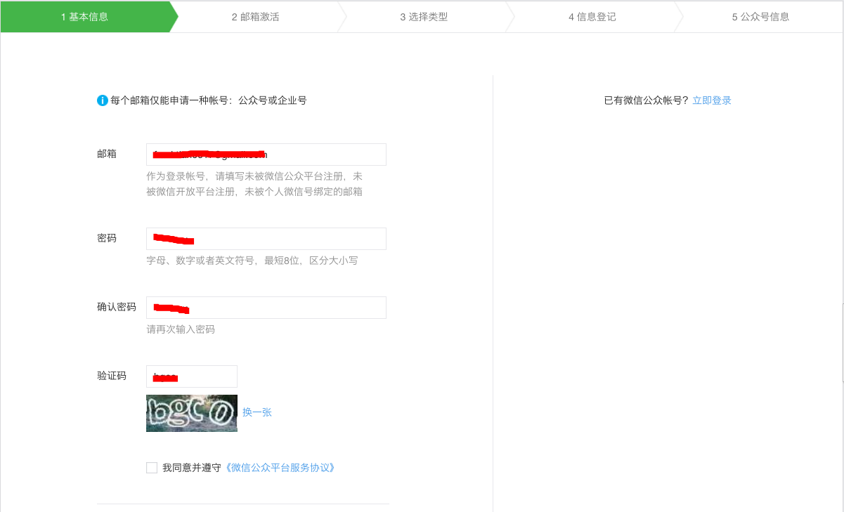 绑定微信公众号如果没有微信公众号,则需要登录https://mp.weixin.qq.com/注册一个微信公众号。创建微信公众号步骤如下: (1)基本信息填写 邮箱(未绑定过微信,未创建过公众号) 密码