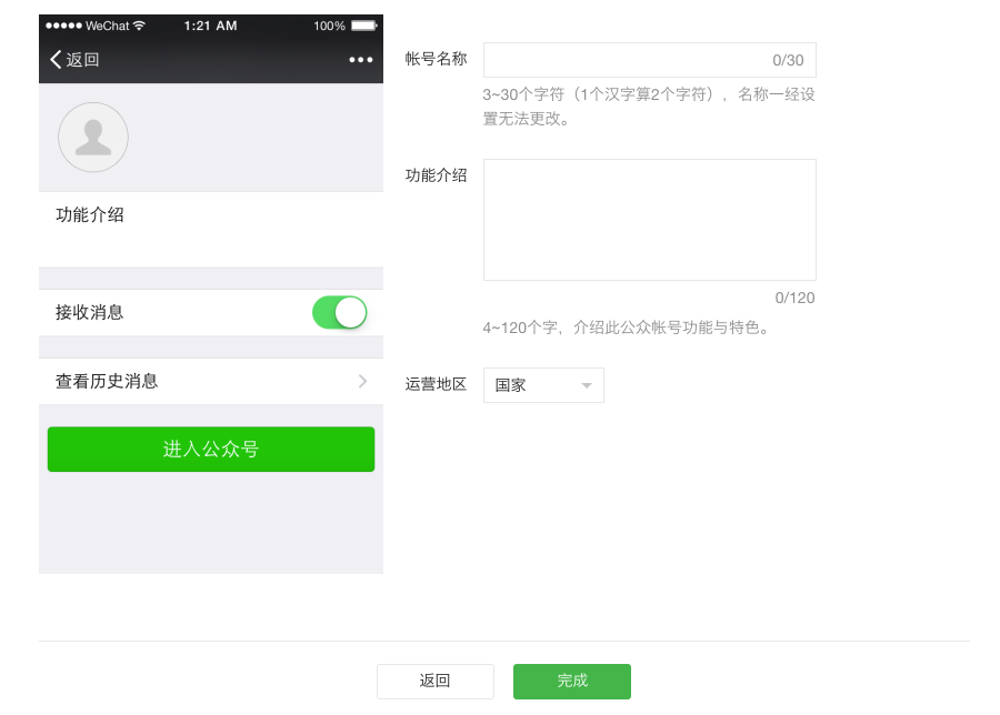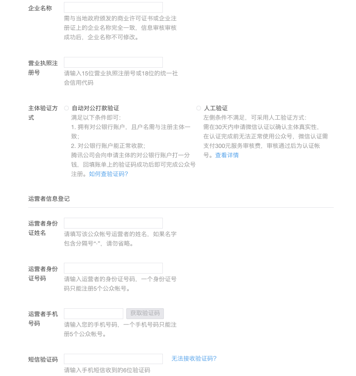 注意:认证方式包括人工验证,自动打款验证,两者区别在于人工验证需要交纳300元验证费,自动打款验证则不需要,但是需要提供对公银行账户。 (5)填写公众号信息 账号名称/账号功能/账号地区等信息