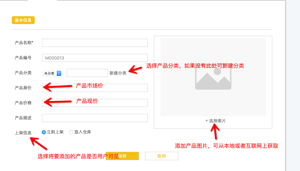 注意:带“*”的为必填项,填完保存即可完成产品的添加