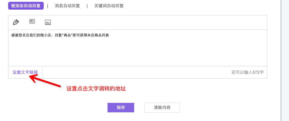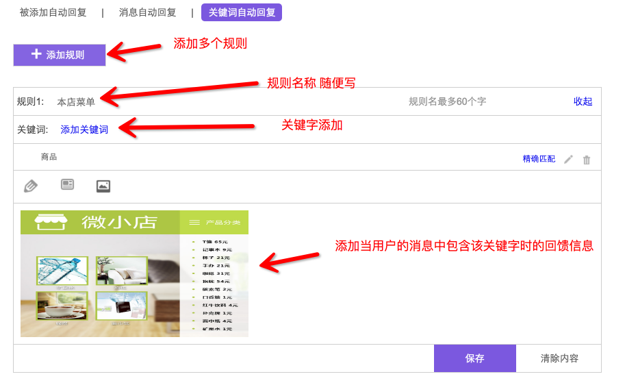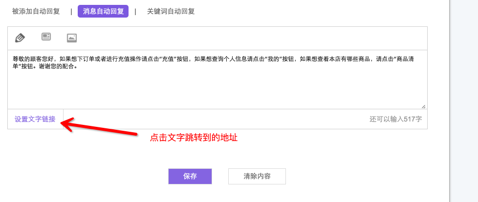 3关键字自动回复关键字自动回复是指当用户发送的消息中含有固定的字或词将按照该关键字自动回复的规则进行回复。