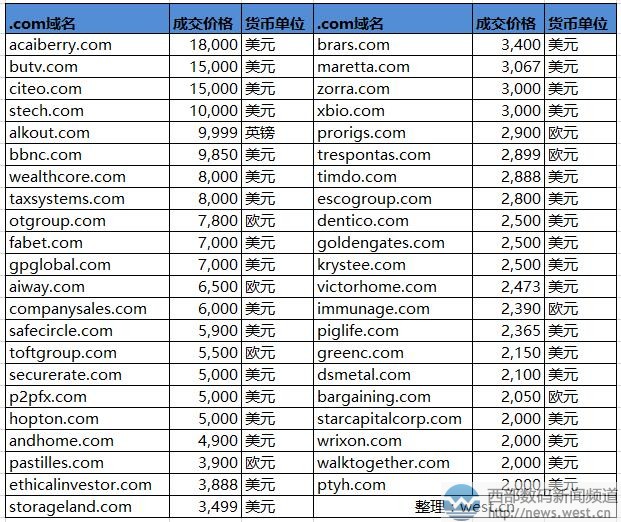 Sedo交易榜:“巴西莓”域名以12万元领衔!终端买了个五字母citeo.com西部数码(west.cn)7月12日消息,最新一期的sedo交易榜出炉,本期上榜的域名共有56个,其中卖价最贵的是英文域名acaiberry.com,成交价为18,000美元,约合人民币12万元。