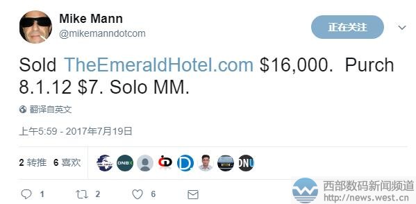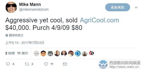 成本仅80美元!Mike Mann以27万元售出“农业”域名西部数码(west.cn)7月25日消息,昨天国外大佬Mike Mann发推称,英文域名AgriCool.com以40,000美元成交,约合人民币27元。而这枚域名当时的成本仅为80美元,人民币539元。
