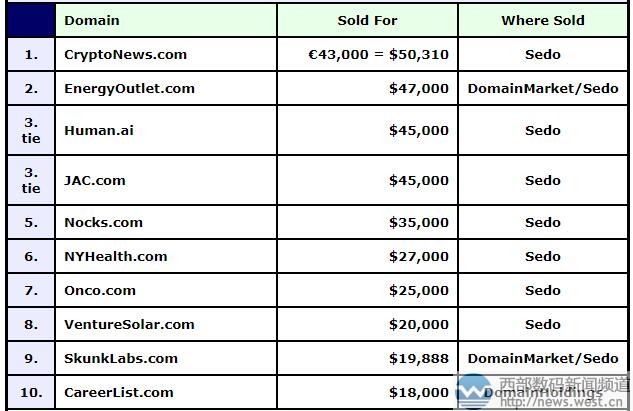 域名cryptonews.com注册于1999年,主体由crypto和news组合而成,具有“加密消息”的意思,用来搭建网络安全平台比较合适。另外,今年以来加密货币(CryptoCurrency)等虚拟货币行情不错,Crypto news也可指代加密货币方面的新闻,用来搭建相关资讯平台也很合适。据查询发现,相关域名cryptonews.biz/.org目前均已建站。 排名第二的是域名energyoutlet.com,成交价为47,000美元,约合人民币31万元。该域名由英文单词“energy”(能源)和“Outlet”(出口、批发)组合而成,适合用于能源相关领域名。 本期DN榜上,国别域名human.ai表现不错,以45,000美元的成交价跻身三强。.ai后缀原是乌拉圭国别域名,但因其与人工智能(Artificial Intelligence)相对应,后多用于人工智能领域。域名human.ai代表有“人、人类”的意思,是很常见的英语词汇,用来搭建人工智能相关平台价值不错。 与Human.ai并列第三的还有三字母域名jac.com,该域名注册于1995年3月,在中文里有“聚爱财”的含义,非常适合搭建金融理财平台。除此以外,jac.com还对应有不少终端,比如jac江淮汽车(jac.com.cn)、JAC外贸实战博客(jacindustry.org)、JAC服装品牌设计(jacline.cn)等等。 除此以外,因为域名nocks.com(作凹痕于、箭扣)以35,000美元成交;组合域名nyhealth.com(纽约健康)以27,000美元成交;onco.com(致癌)成交价为25,000美元。其他域名也有不错表现,交易详见下图: