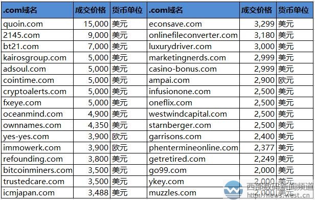 域名quoin.com注册于2001年6月,是英文单词“突角、隅石”的意思。从含义上看,该域名并没有什么特别之处,不过却对应有软件公司QuoinInc以及女性饰品品牌Quoin,由此可见可应用的领域很广。目前域名quoin.com被德国一家资讯网站收购,官网域名为t-online.de。 本期sedo榜上,.com域名表现平平。排名第二的数字域名2145.com成交价为9000美元,约合人民币6万元。该域名注册于1999年,距今已经18年历史了,拥有一般四数字域名的短小精湛和建站不受限制等优势,市场价值比较坚挺。 随后是杂米域名bt21.com,成交价为7000美元,从品相和含义上分析,该域名比较适合搭建比特币交易及游戏平台。除此以外,本期sedo上多个英文域名成交,比如cointime(硬币时间)、adsoul.com(广告灵魂)均以5000美元结拍。