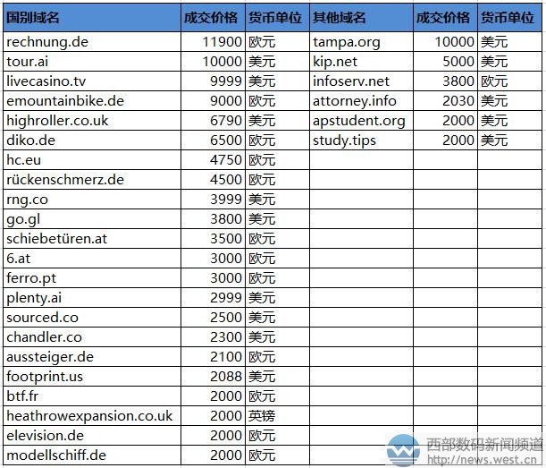 国别域名方面,德国域名再次名列前茅。继上周rechnung24.de以18,000欧元夺得第一后,本期rechnung.de又以11,900欧元成交,约合人民币9.3万元。“rechnung”有“账单”的意思,适合搭建财务票务类网站。 除了.de域名,安圭拉国家域名tour.ai也以10,000美元成交,人民币大概是6.6万元。“tour”是“旅游、观光”的意思,在全球都是非常通用的词语,所以域名tour.ai很适合搭建旅游平台。 其他域名方面,tampa.org成交价为10000美元,对应有美国佛罗里达州西部港市——坦帕,适合搭建地方政务以及门户类网站,另外旅游、招聘等生活类平台也可使用该域名。 本文转载自新闻资讯,原文链接:Sedo榜:终端近10万元买下“突角”域名!两枚国别域名表现抢眼