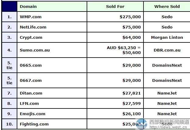 DN榜:域名WMP.COM以180万元夺冠!netlife.com近49万元结拍!