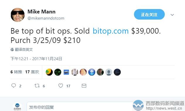 比特币的风大佬也要跟!Mike Mann超25万元出售域名bitop.com西部数码(west.cn)11月27日消息,比特币的这把火已经持续烧了很长时间了,光是今年以来,相关域名就跟着水涨船高,不少投资人因此获利颇丰。当然域名圈最会销售域名的人也不例外,上周五Mike Mann就以39000美元出售了域名bitop.com,约合人民币25.7万元。