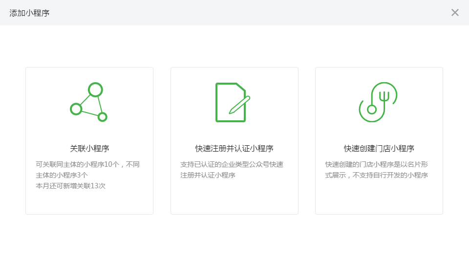 关联规则: 所有公众号都可以关联小程序。 一个公众号可关联10个同主体的小程序,3个不同主体的小程序。 一个小程序可关联3个公众号。 公众号一个月可新增关联小程序13次,小程序一个月可新增关联5次。