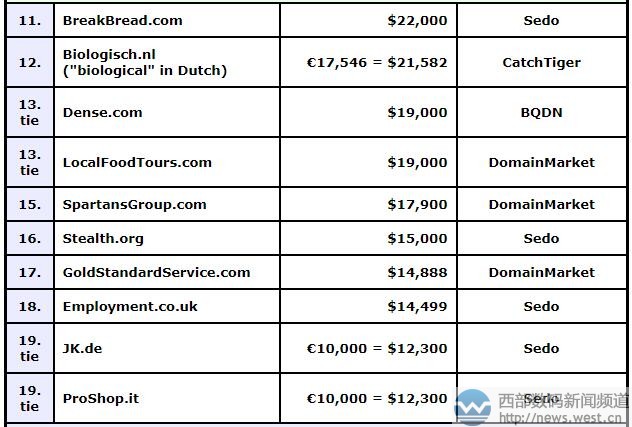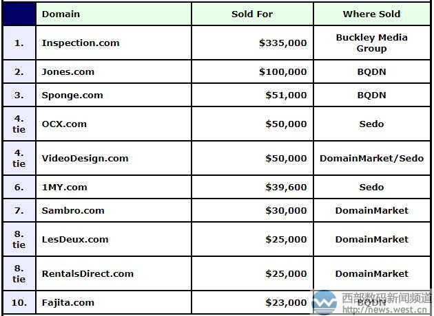 域名inspection.com是“检验、检测”的意思,是十分通用的英文单词,适合搭建检测软件、检验平台等。据了解,域名inspection.com由 Ms. Buckley中介成交,过去两年时间均由其委托出售。此次以212万元收购inspection.com的是总部位于香港的亚洲质量检测公司 Asia inspection,官网域名为Asiainspection.com。拿下inspection.com将用于品牌域名升级。 排在第二的是以100,000美元在BQDN平台成交的域名Jones.com,约合人民币63万元。该域名注册于1996年,在英文中是一个较为普遍的人名,译为“琼斯”。因为该词使用较广,不少终端以此命名开展业务,比如滑雪产品供应商Jones,官网启用jonessnowboards.com;再比如服饰品牌JACK&JONES,域名为jackjones.com。紧随其后的域名sponge.com也在BQDN成交,价格为51,000美元,是“海绵、海绵状物”的意思,也对应有不少终端。 接下来是均以50,000美元并列第四的三字母域名OCX.COM和英文组合域名videodesign.com。前者对应有OCX控件;后者是“视频设计”的意思,可用于视频、广告设计等领域。总的说来,这两个域名的应用价值都不错。 本期DN榜上,三杂域名1MY.COM以39,600美元跻身榜单前10。虽然品相上不如纯字母域名,但三个字符的域名胜在简短好记,推广和宣传都很容易,因此市场价值也不容小觑。据whois信息显示,域名1my.com的持有者为上海铜钱投资股份公司,不知道终端接下来是否会启用该域名。 同样跻身10强的还有域名sambro.com,成交价为30,000美元,是“山姆兄弟”的意思;域名lesdeux.com,成交价为25,000美元,由大佬Mike Mann售出,据说Mike Mann在2010年收购该域名时成本仅为265美元。 其他域名交易情况,详见下表: