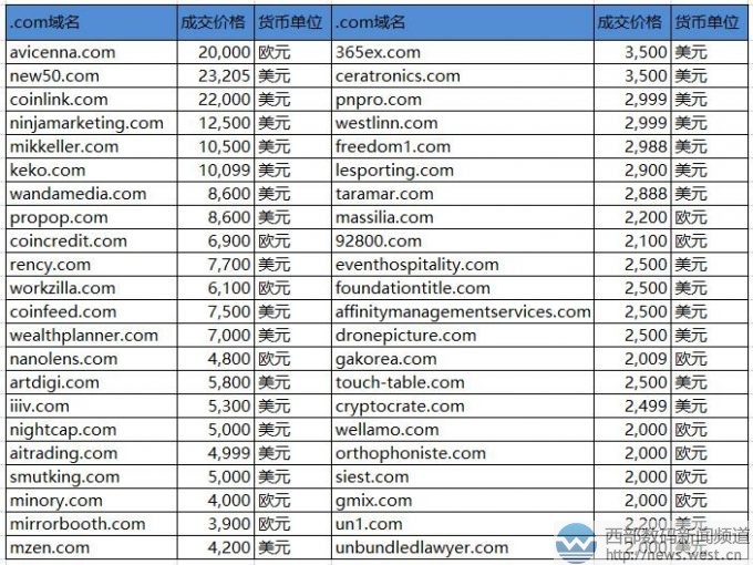.com域名方面,五位数成交的域名共有6个,其中域名avicenna.com以20,000欧元成交,约合人民币15.7万元。主体“avicenna”对应有知名波斯医生阿维森纳,另外一所国外avicenna学校也与之对应,官网启用域名avicenna.edu.pk。 英文和数字的组合域名news50.com也拍出了23,205美元的价格,人民币大概是14.6万元。据whois信息查询,该域名的背后买家是los angeles news(洛杉矶新闻),收购该域名或将搭建新闻类网站。 除此以外,域名coinlink.com(币链)、ninjamarketing.com(忍者营销)、mikkeller.com(美其乐)等域名则分别以22,000美元、12,500美元以及10,500美元成交。