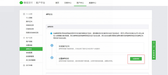 2.2 商家密钥点击“账户中心”->“API安全”菜单,设置32位密钥并记录备份,如下图示; 注意:密钥填写错误会导致支付异常,如期间修改请重新登录商城后台同步修改参数。