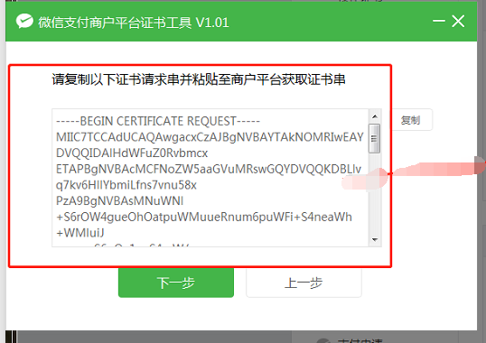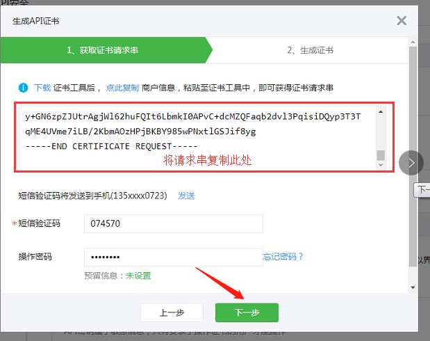 6、在证书工具里复制的证书串点后返回【微信支付商户平台】,将复制的证书请求串粘贴至生成aid证书的页面,并输入短信验证码及操作密码,点击下一步