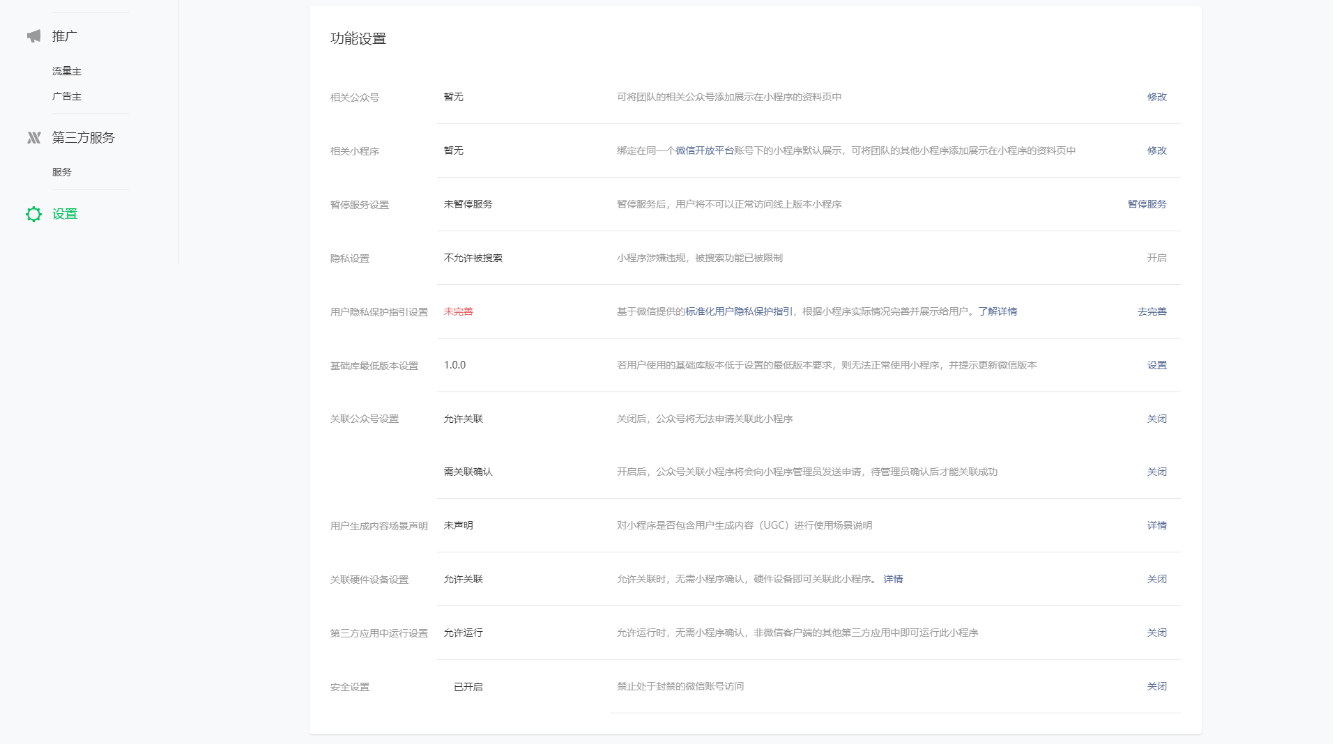 非代开发小程序用户隐私保护配置非代开发小程序的用户请登陆微信公众平台(https://mp.weixin.qq.com)在【小程序管理后台-设置-功能设置-用户隐私保护指引】自行配置 第一步:登录小程序管理后台在【设置-功能设置-用户隐私保护指引】点击【去完善】