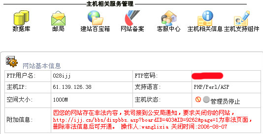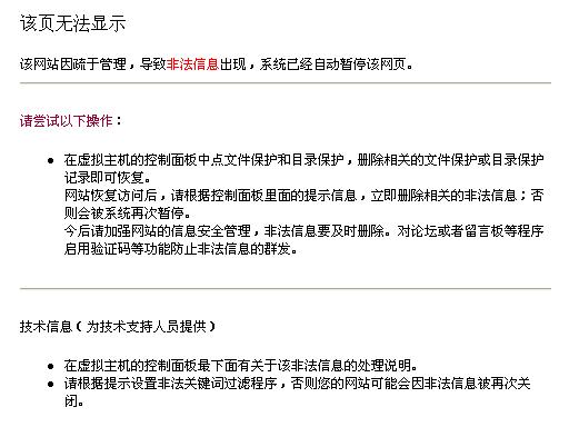 如果您的网站因管理不善多次出现非法信息或者出现重大非法信息,虚拟主机会被管理员关闭,