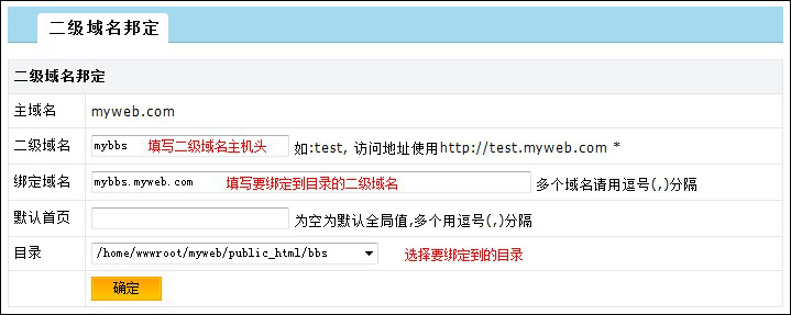 二级域名:填写主机头就可以了,比如要用mybbs.myweb.com来访问,二级域名那填写mybbs 绑定域名:填写完整的要访问的域名,如要用mybbs.myweb.com访问就填写mybbs.myweb.com,不用加http:// 默认首页:保持默认 目录选择:选择需要绑定到的子目录,这里我们选择bbs目录测试。如图: