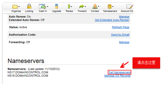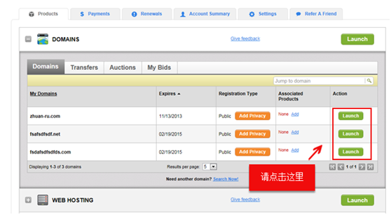 2、点击Products标签中DOMINS前面的【+】,展开域名列表。 3、展开域名列表后,找到需要修改DNS的域名,点击对应的【Launch】按钮。 4、点击后在新页面中找到Nameservers部分,点击【Set Nameservers】。 5、在弹出层的输入框中填写您的域名DNS服务器地址,点击【OK】即可完成设置。