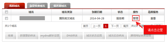 2、在域名管理页面找到要修改DNS的域名,点击【管理】 3、打开页面后,点击【域名管理】