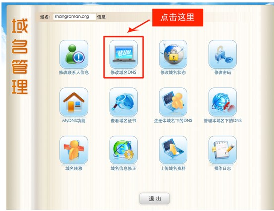 4、点击域名后将打开如下页面,点击【修改域名DNS】。