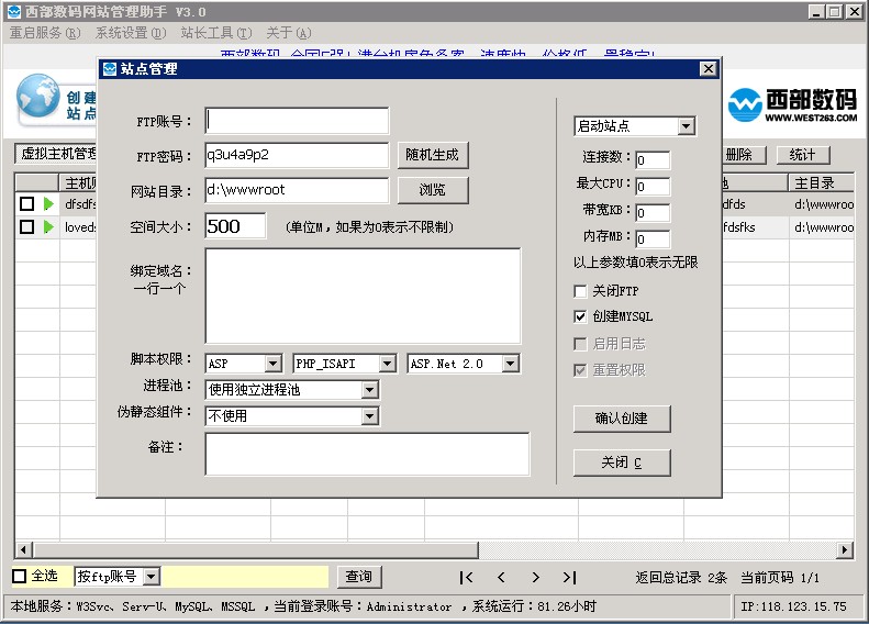 1. 网站管理:一键添加网站(IIS)、添加网站FTP、自定义网站目录、创建MySql数据库、自定义网站支持脚本(如:asp/php/asp.net)、站点权限独立设置。
