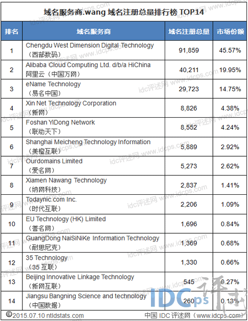 IDC评述网(idcps.com)07月13日报道:根据ntldstats.com发布的最新数据显示,截止至2015年7月10日17时30分,.wang域名注册总量十四强排名情况,与上期6月29日相比,无任何变动。其中,西部数码较上期净增18,643个,.wang域名总量升至91,859个,继续称霸.wang域名市场。下面,请看IDC评述网对相关数据的整理与分析。