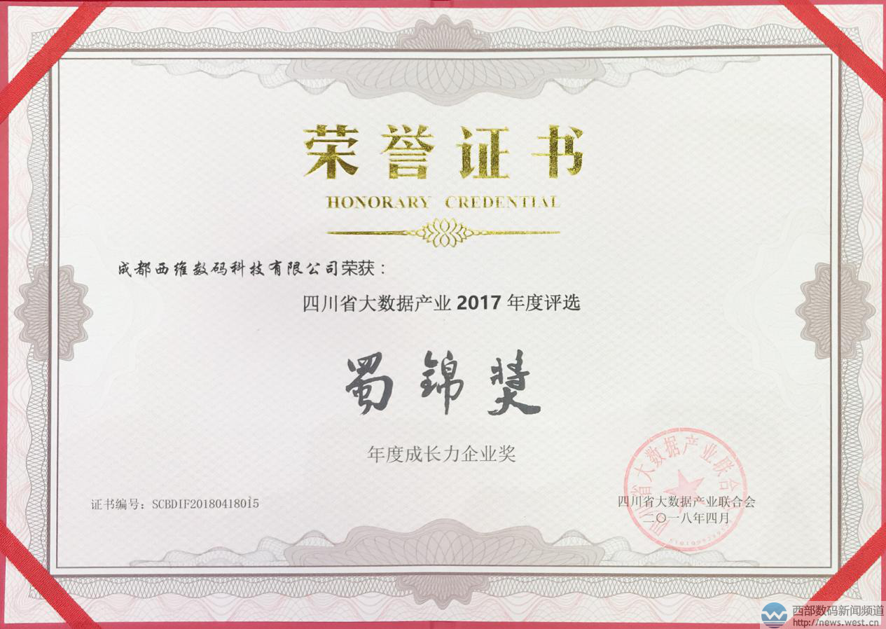 图:四川省大数据产业2017年度“蜀锦奖” 西部数码获奖证书